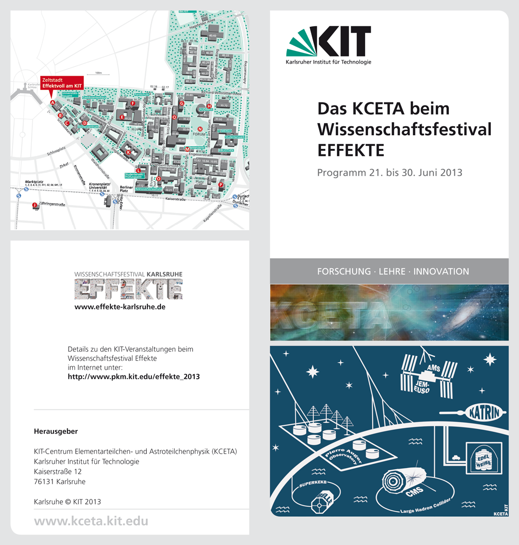 Am Tag der offenen Tür besuchten interessierte Karlsruher jeden Alters den KCETA-Infostand im Mathematikgebäude. Neben spektakulären Experimenten mit flüssigem Stickstoff und der "Zerstörung" von Schaumküssen in einem Vakuumzylinder war auch ein vom KIT entwickelter Octocopter zu sehen. Am Teilch-O-Mat konnte jeder in einem nicht ganz ernst gemeinten Persönlichkeitstest herausfinden, welches der Elementarteilchen am besten zu ihm passt und sich einen entsprechenden Button anfertigen lassen. Außerdem gab es natürlich Informationen über die vielfältige Beteiligung von KCETA an internationalen Großexperimenten zur Erforschung der Elementar- und Astroteilchen.